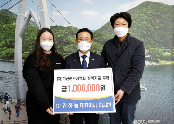 충북 괴산군은 ㈜뭐하농 이지현 대표이사(전 괴산군 4-H연합회 부회장)가 괴산군민장학회에 장학기금 100만원을 기탁했다고 24일 밝혔다.